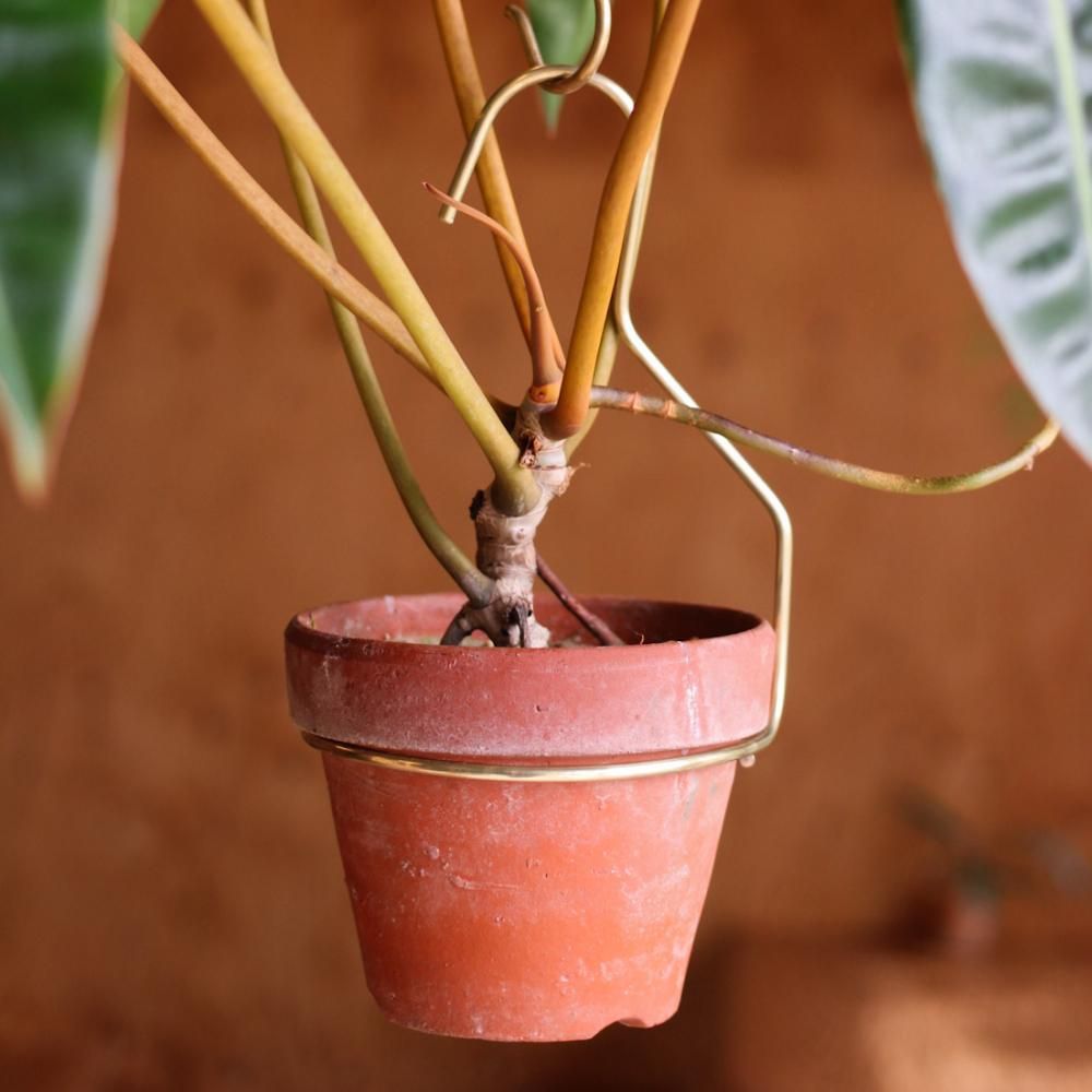 国産の3号サイズの素焼き鉢や駄温鉢に合わせて製作した真鍮製のAraheamオリジナルのハンギングツール。今まで置き型で管理していた植物がハンギングされると、違った表情を見せてくれます。ハンドメイドのアイテムのため一点一点サイズや形に個体差があります。