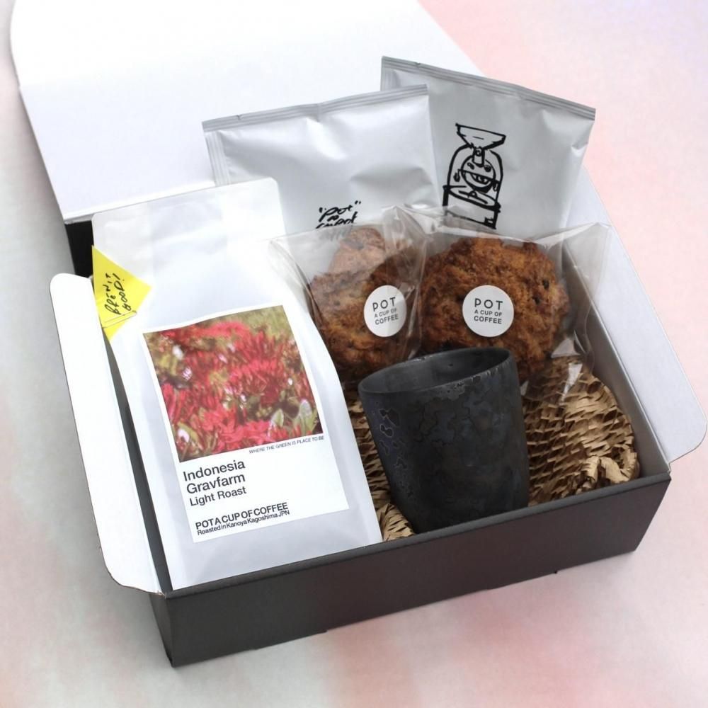 自家焙煎のコーヒー豆とドリップバッグ、店内工房で焼き上げたアメリカンクッキー、そして鹿児島の陶器〈ONE KILN〉のマグカップをひとつの箱にぎゅっと詰めました。