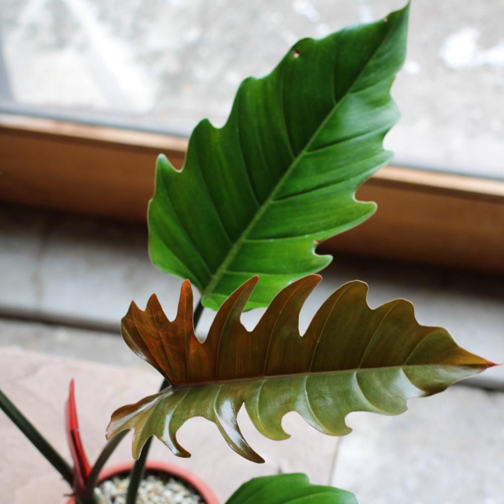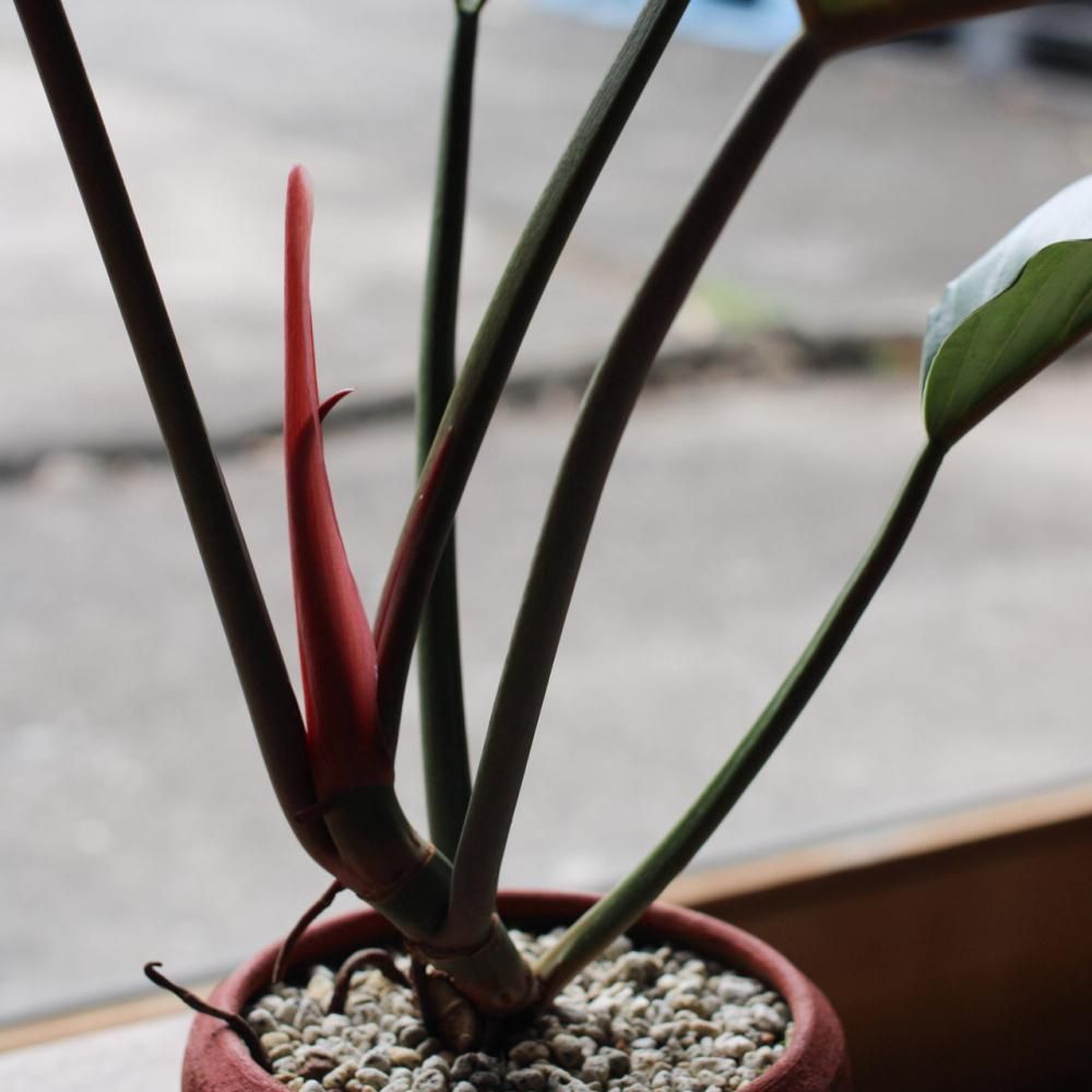 ギザギザの葉と赤から緑へ変化していく新芽が特徴的なPhilodendron Pluto。